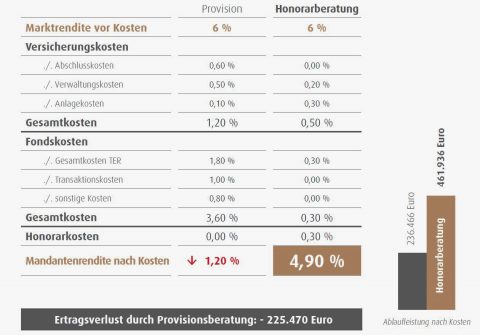 Durch die Laufzeiten der meist undurchsichtigen Finanzprodukte kommt das Erwachen meist erst viel zu spät. Viele Banken und Vermögensberater vernichten Vermögen. Sehr oft gibt es Unternehmens-, Produktverkaufs- und Provisionsinteressen. 2 % Mehrrendite sind durch reine Honorarberatung nachweisbar möglich.
